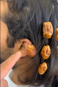 خلاقیت مشاغل؛ ابتکار باورنکردنی آرایشگر تهرانی در تزئین موی سر مشتری با دانههای خرما + ویدیو/ این بیچاره راه بره کلی مگس و زنبور دورش جمع میشن آخه؟😂