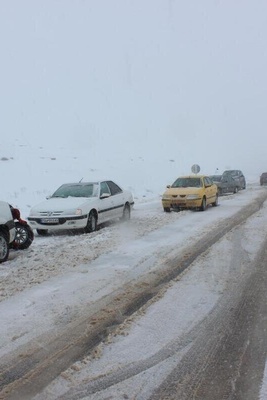 بارش شدید برف در اشنویه و گیر کردن ماشین ها در جاده + فیلم