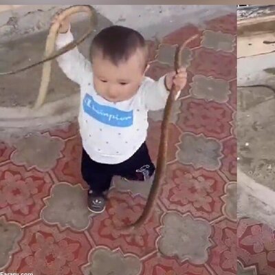ویدئویی ترسناک از بازی یک کودک نوپا با دو مار زنده