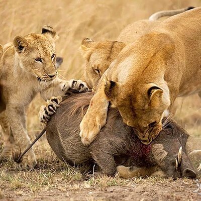 حمله وحشیانه گله ای شیر ها به خانواده گراز ها