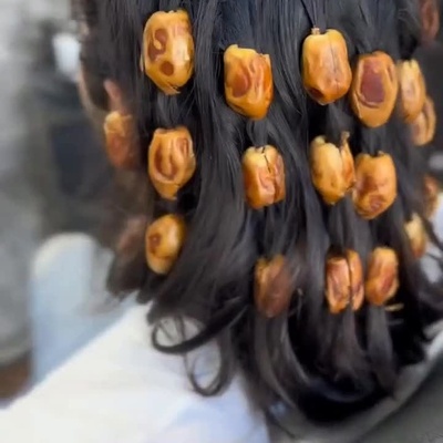 خلاقیت خنده دار آرایشگر تهرانی در تزئین موی مشتری با خرما؛ از آویزان کردن خرما از موها تا پیرسینگ گوش با خرما+ویدیو/ اینجا واقعا باید گفت هنر نزد ایرانیان است و بس😂
