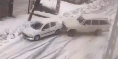 ببینید؛ لحظه نفسگیر لیز خوردن ماشین های در خیابان های یخ زده سردشت درپی بارش برف