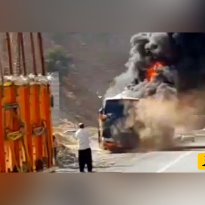 لحظه انفجار مهیب کامیون در پمپ بنزین و نجات معجزه آسای مرد جوان
