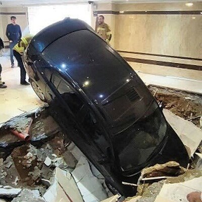 فرورفتن وحشتناک مزدا در پی فرونشست پارکینگ ساختمانی در قیطریه + عکس