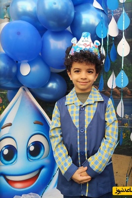 نگاهی به جشن آب پرطمطراق مهدیار کلایی، پسر محسن تنابنده، بازیگر سریال پایتخت در مدرسه ابتدایی/ چیدمان میز با کیک فوندانتی و ریسه های قطرات آب با تم آبی+فیلم و عکس