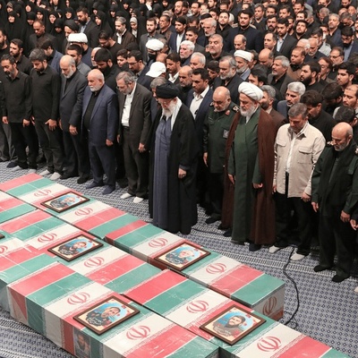 اولین تصویر از تابوت شهید علی لاریجانی در کنار فرزندش مرتضی لاریجانی در معراج شهدا
