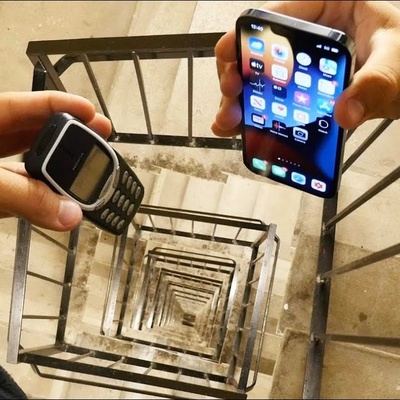 تست سقوط آیفون ۱۳ پرو و نوکیا ۳۳۱۰ از راهپله یک ساختمان ۲۵ طبقه +فیلم