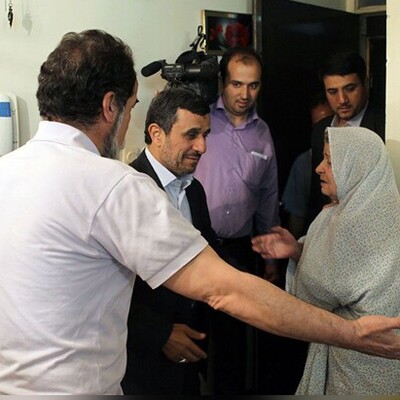عیادت و حضور سرزده احمدی نژاد در خانه پدری ساده و بدون تجملات ابوالفضل پورعرب در تهران/ پدر ساعد سهیلی هم بود+عکس