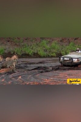 (ویدئو) تلاش یک شیر برای بیرون کشیدن خودروی گیر افتاده در گل و لای
