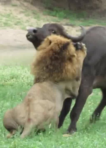 (فیلم) حمله بیرحمانه سه شیر نر به یک بوفالو پس از زایمان