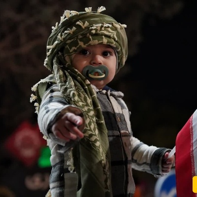 کودک دو سالهای تبریزی در میدان ساعت با شعار مرگ بر آمریکا مرگ بر اسرائیل