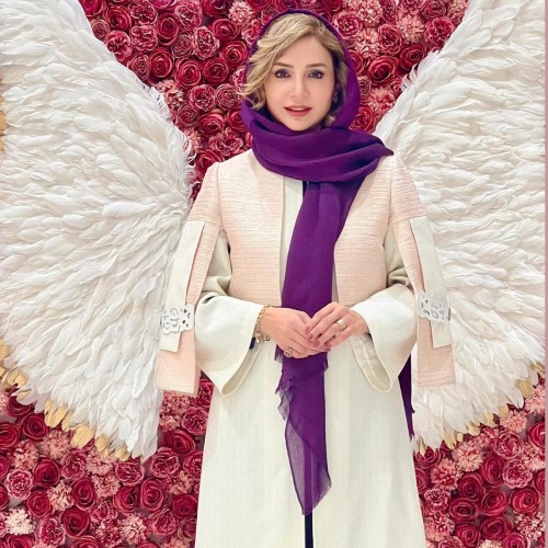 ترکیب رنگ جذاب لباس خانم بازیگر با یک جعبه گل