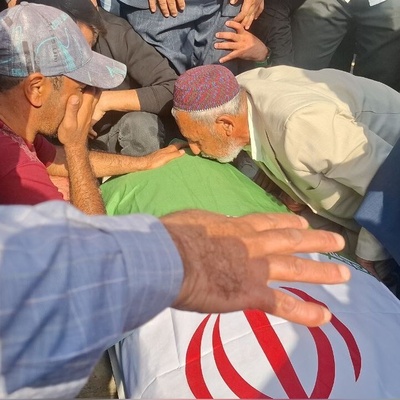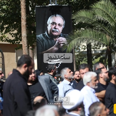 اولین فیلم از حال و هوای غم زده و دلگیر مراسم خاکسپاری محمد کاسبی با حضور اقوام درجه یک این هنرمند/ برافراشته شدن بنر تسلیت در سراسر مراسم
