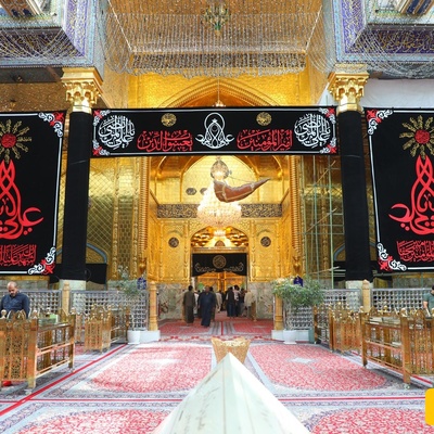 مراسم نصب کتیبه عزا بر ایوان طلای حرم امیرالمؤمنین برای استقبال از محرم