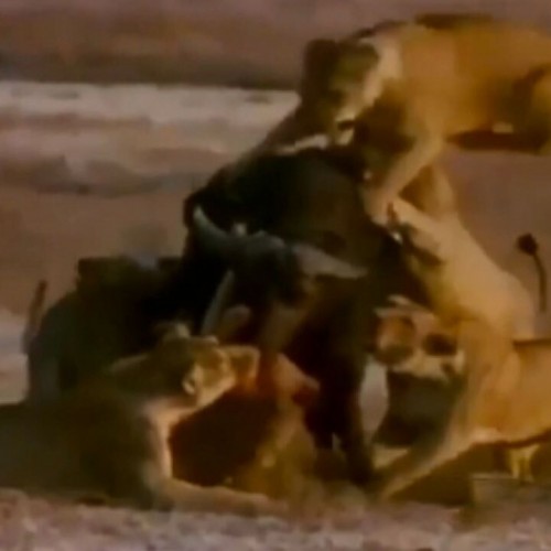 (فیلم) مقاومت دیدنی بوفالو در مقابل گله شیرها