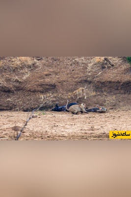 مستند حیات وحش حیوانات/ تلاش تمساح شجاع برای دزدیدن لاشه بوفالو از دست شیرهای گرسنه!+ ویدئو