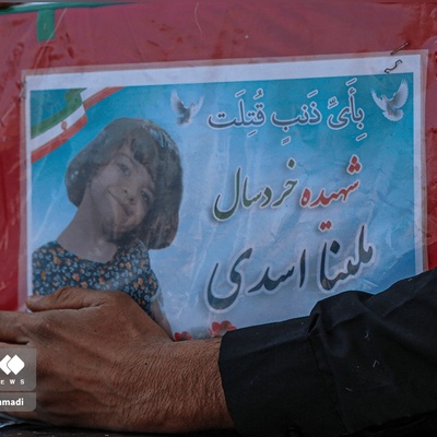 تصویری متفاوت از یک بانوی ایرانی با حجاب متفاوت در تشییع پیکر ملینای 3 ساله در کرمانشاه / ای پرچمت ما را کفن ...