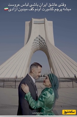 ابتکار منحصربفرد یک زوج در ضبط کلیپ فرمالیته عروسیشان در میدان آزادی؛ از لباس عروسی به شکل پرچم ایران تا نقشه ایران به جای دسته گل در دستان عروس+فیلم