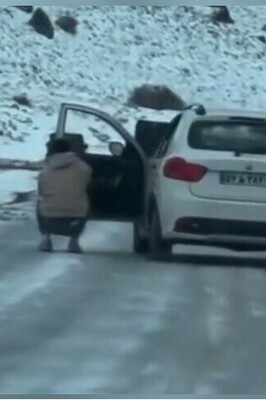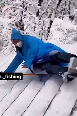 صحنه وحشتناک افتادن گردشگران از پلههای برفی شبیه قلعه رودخان و خطرناک + ویدئو