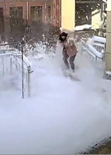 (فیلم) فرار یک زن از سقوط برف از پشت بام ساختمان