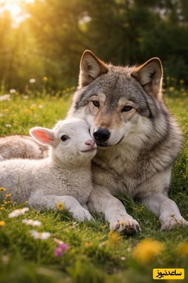 لحظهای باورنکردنی دوستی گرگ و بره در قاب طبیعت / مهربانی گرگ