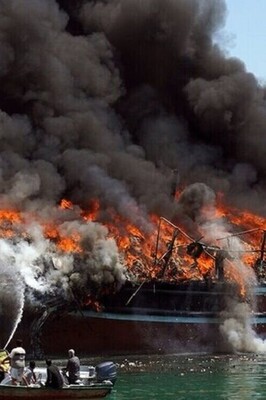 لحظه نجات ملوانان خرمشهری از دل یک لنج آتش گرفته توسط ماهیگیران بوشهری +فیلم