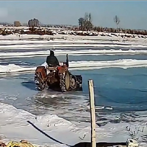 (فیلم) سقوط تراکتور به داخل دریاچه یخ زده