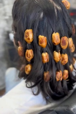 خلاقیت مشاغل؛ ابتکار باورنکردنی آرایشگر تهرانی در تزئین موی سر مشتری با دانههای خرما + ویدیو/ این بیچاره راه بره کلی مگس و زنبور دورش جمع میشن آخه؟😂