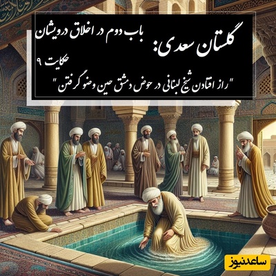 پندهای گلستان سعدی: راز افتادن شیخ لبنانی در حوض دمشق حین وضو گرفتن / باب دوم در اخلاق درویشان حکایت شماره 9 + فایل صوتی و نسخههای قدیمی