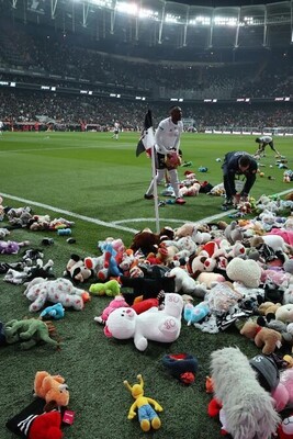 یادی کنیم از اقدام تحسین برانگیز هواداران تیم بشیکتاش/ پرتاب هزاران عروسک به زمین برای کمک به کودکان زلزله زده