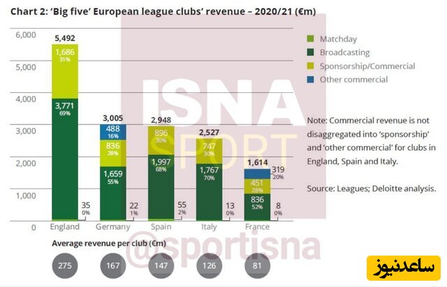 در ادامه آماری از درآمدهای پنج لیگ معتبر اروپایی به خصوص پریمیرلیگ انگلیس را مشاهده میکنید که اهمیت حق پخش تلویزیونی را بیشتر از قبل مشهود میکند.