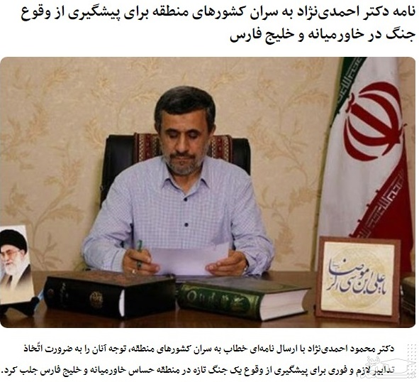 محمود احمدی نژاد دی ماه ۱۳۹۹ مدعی یک جنگ حتمی است. وی در نامه ای به روحانی رئیس جمهور وقت ایران و سران کشورهای منطقه مدعی شد: «از مجموع تحوّلات، موضع گیری ها و اخبار منتشره در رسانه های مختلف جهان چنین استنباط می شود که وقوع یک جنگ مخرّب جدید در منطقه حسّاس خاورمیانه و خلیج فارس برنامه ریزی شده و در مسیر اجرای قریب الوقوع قرار گرفته است».