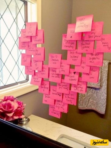 روی کاغذ رنگی های کوچک، جملات عاشقانه بنویسید و به آینه بچسبانید تا وقتی از خواب بیدار می شود غافلگیر شود.