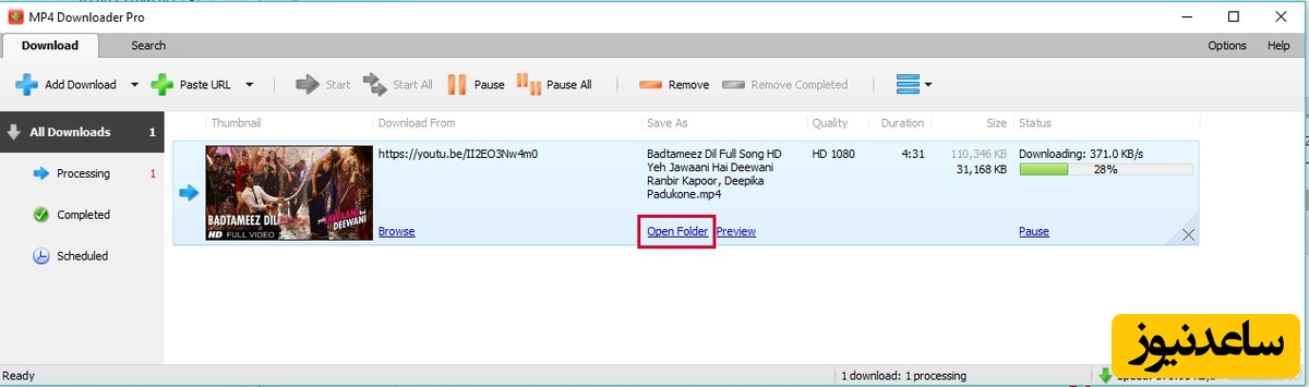 3- به همبن سادگی ویدئوی شما در حال دانلود شدن است و بعد از پایان دانلود می توانید Open Folder را بزنید و تمام ویدئوهایی که دانلود کردید را ببینید.