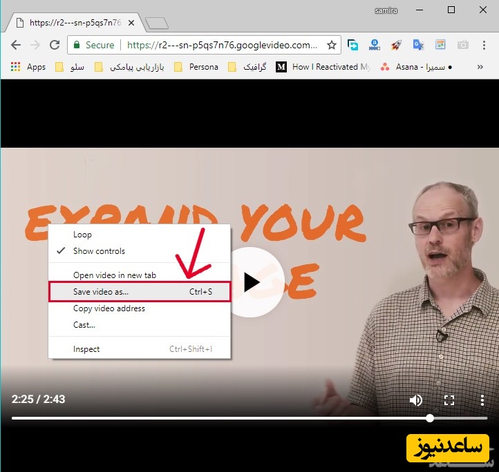 6- در این مرحله ویدئو در پنجرۀ مرورگر شما در حال پخش است. روی ویدئو کلیک راست کنید و روی گزینه Save video as کلیک کنید.