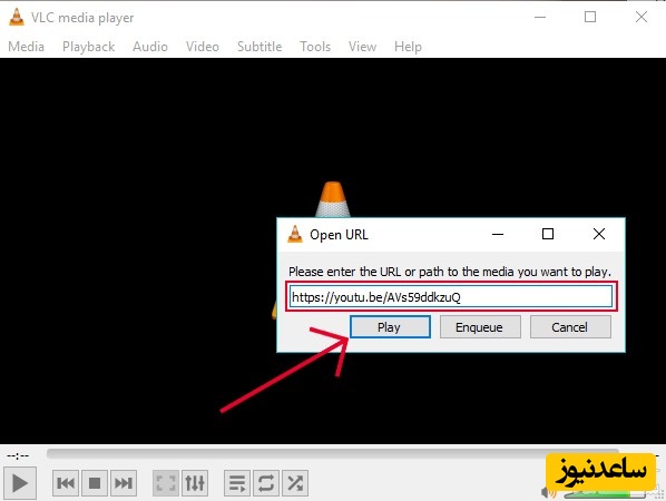 3- در پنجرۀ باز شده آدرس ویدئو را Paste کنید یا Ctrl+V را بزنید. سپس Play را بزنید.