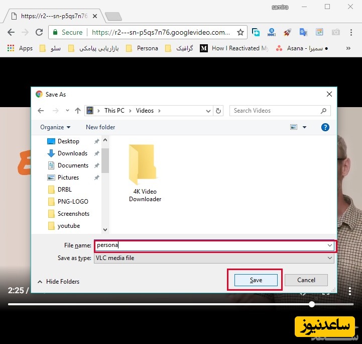 7- خب، رسیدیم به مرحلۀ آخر. در این مرحله مکانی که می خواهید ویدئو آنجا ذخیره شود مشخص کنید و یک نام برای ویدئو بنویسید. در آخر هم Save را بزنید. تبریک می گویم، ویدئوی شما از یوتیوب دانلود و ذخیره شد.