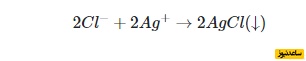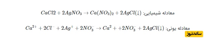 معادله یونی بالا را این گونه می توان توصیف کرد که دو یون کلرید – ناشی از کلسیم کلرید – با دو کاتیون نقره – ناشی از نقره نیترات – وارد واکنش می شوند تا رسوب نقره کلرید به تولید برسد.