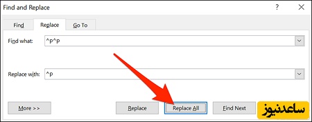 در بخش Replace with، عبارت ^p را وارد کنید. زمانی که این عبارت را در بخش Replace with وارد می کنید، با عبارت ^p^p که در قسمت Find what وارد کرده اید، جایگزین می شود و خطوط اضافی و خالی حذف خواهند شد.