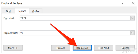 - در بخش Replace with، عبارت ^p را وارد کنید. زمانی که این عبارت را در بخش Replace with وارد می کنید، با عبارت ^p^p که در قسمت Find what وارد کرده اید، جایگزین می شود و خطوط اضافی و خالی حذف خواهند شد.