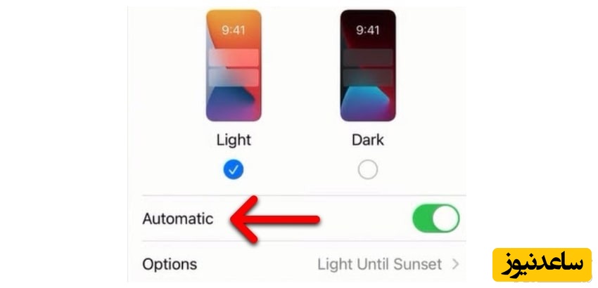 Options: با این گزینه شما می توانید تعیین کنید که چه ساعتی در روز گوشی آیفون تان دارای تم دارک باشد و در چه ساعت هایی تم لایت داشته باشد.