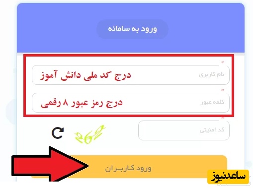 کد ملی دانش آموزان را در قسمت "نام کاربری" و رمز عبور 8 رقمی دریافت شده از مدیر مدرسه را در قسمت "رمز عبور" وارد کنید: