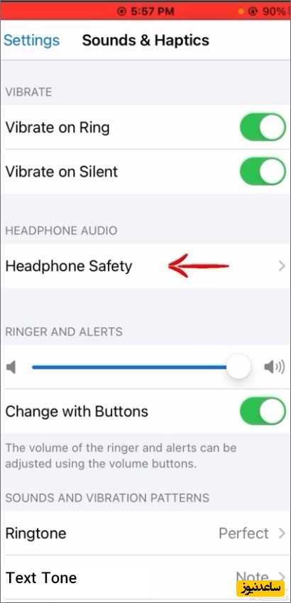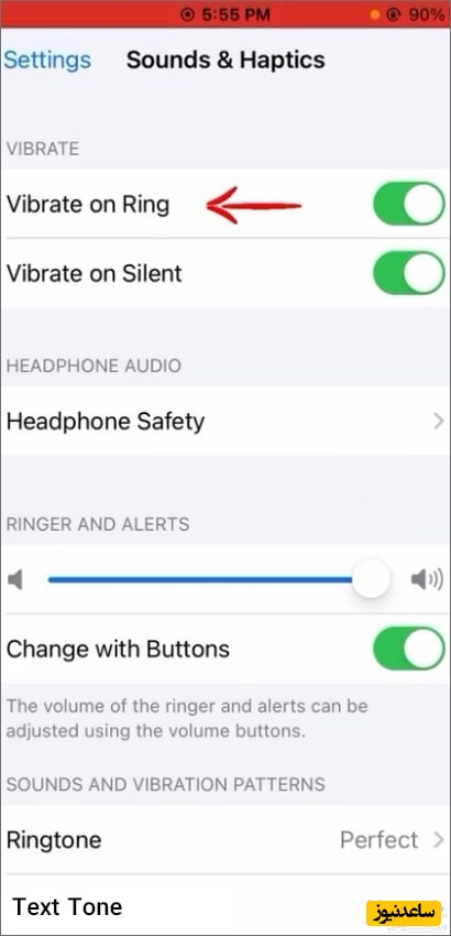 دوباره وارد Sounds & Haptics می شویم. در این صفحه گزینه ای وجود دارد با نام Change with Buttons که با این گزینه می توانید انتخاب کنید که صدای گوشی آیفون شما هنگام زنگ خوردن با کلید های کنار گوشی کم و زیاد بشود یا خیر. اگر این گزینه خاموش باشد شما با کم و زیاد کردن صدای گوشی فقط می توانید صداهای رسانه ( موزیک و فیلم و …) گوشی را تغییر دهید و صدای زنگ شما ثابت می ماند.