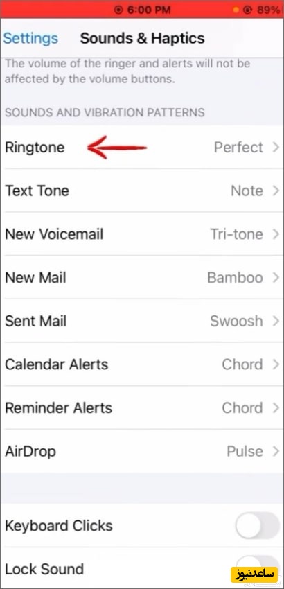 با استفاده از گزینه Ringtone شما می توانید صدای زنگ گوشی را تغییر دهید. با استفاده از این گزینه شما حتی می توانید صدای پیام ، ایمیل، صدای تقویم، نوتیفیکیشن های ایردراپ، صدای کیبورد و… را تغییر دهید. همچنین می توانید با استفاده از گزینه Lock Sound انتخاب کنید که هنگام قفل کردن صفحه گوشی صدا داشته باشد یا خیر. (اگر شما مشکل قطع شدن صدای اس ام اس آیفون را دارید پیشنهاد می کنم تنظیمات این قسمت را با دقت بیشتری بررسی نمایید)