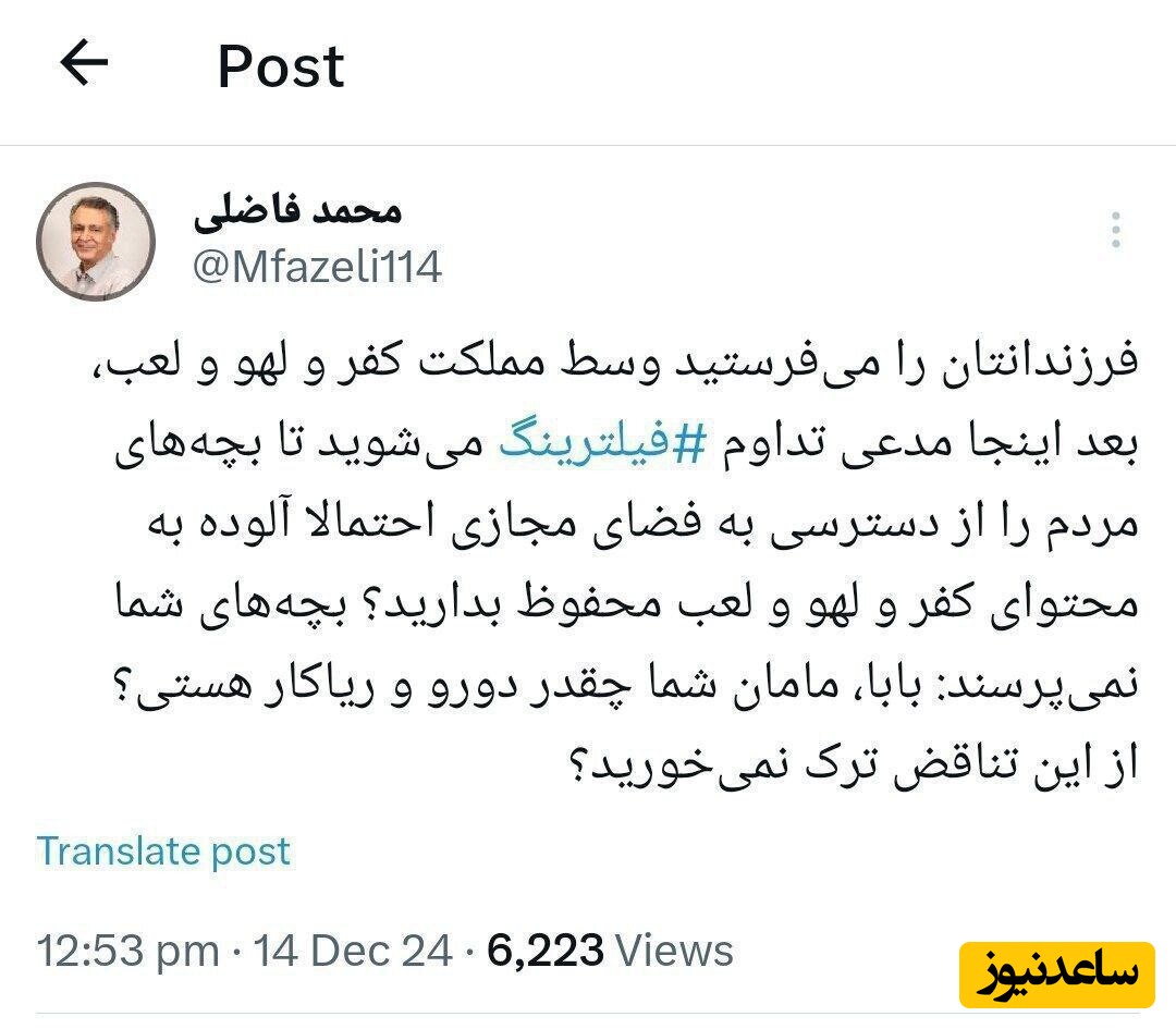 به گزارش پایگاه خبری ساعدنیوز، محمد فاضلی، جامعهشناس ایرانی و استادیار سابق دانشگاه شهید بهشتی، در انتقاد به برخی حامیان فیلترینگ با انتشار توئیتی واکنش نشان داد.