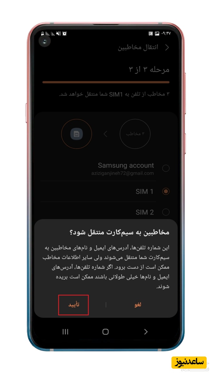 7. در آخر پس از انتخاب گزینه انتقال، مخاطبین شما به سیم کارت منتقل می شوند.