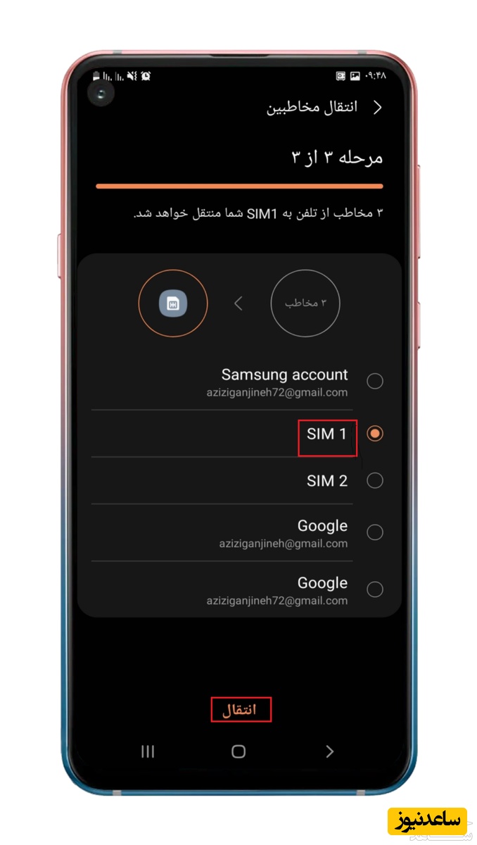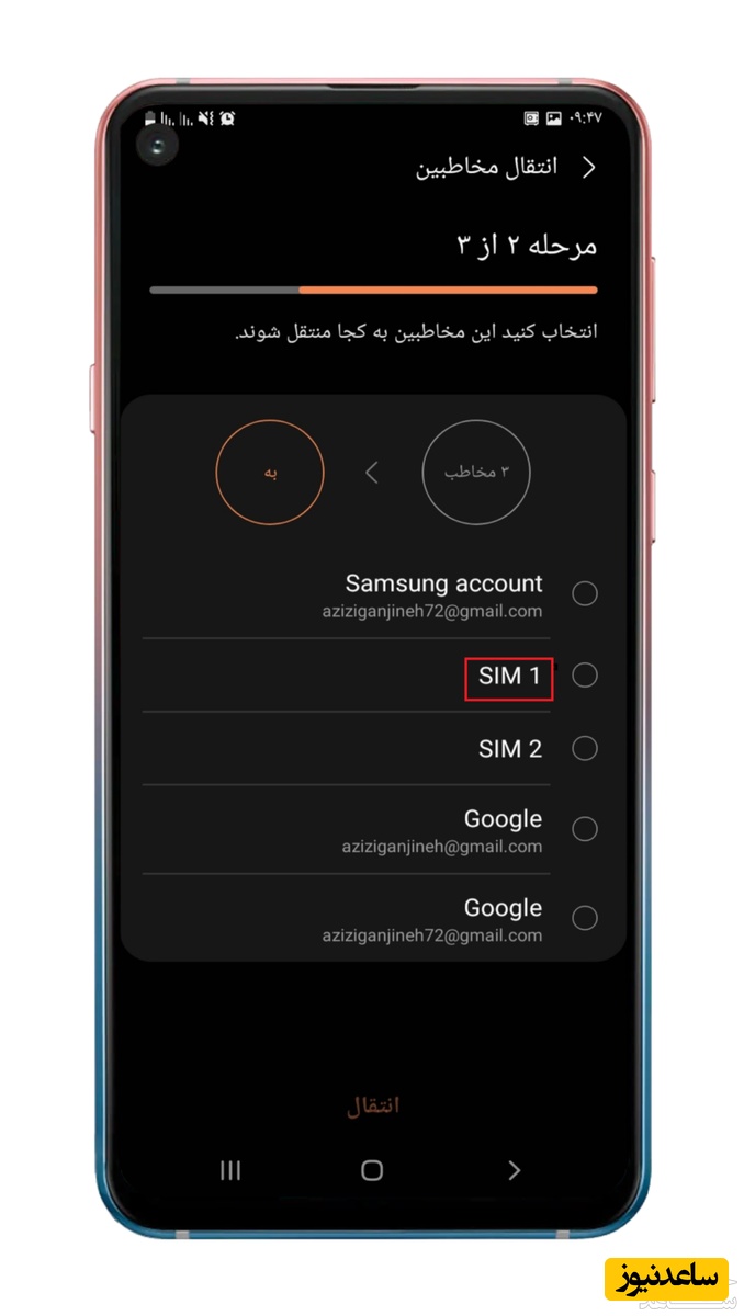 جهت انتقال مخاطبین از سیم کارت به گوشی، باید تمام مراحل مرحله قبل را انجام دهید فقط در زمان انتقال، مبدأ انتقال را سیم کارت و مقصد انتقال را تلفن انتخاب کنید، خواهید دید مخاطبین شما در کمتر از یک دقیقه به تلفن همراهتان منتقل خواهد شد. تصاویر انتقال مخاطب از گوشی سامسونگ نمونه برداری شده است تمام مراحل انتقال مخاطب در گوشی شیائومی هم به همین صورت می باشد.