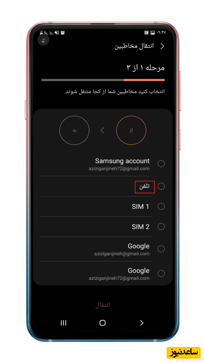 3. در این مرحله انتخاب می کنید مخاطبین از کجا انتقال داده شوند: که ما در این قسمت تلفن را انتخاب می کنیم.
