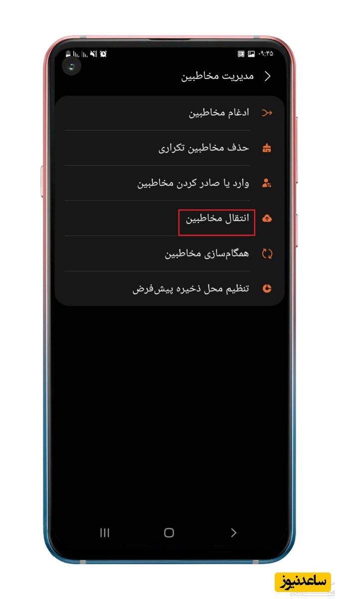 2. از منوی مدیریت مخاطبین گزینه انتقال مخاطبین را انتخاب کنید.