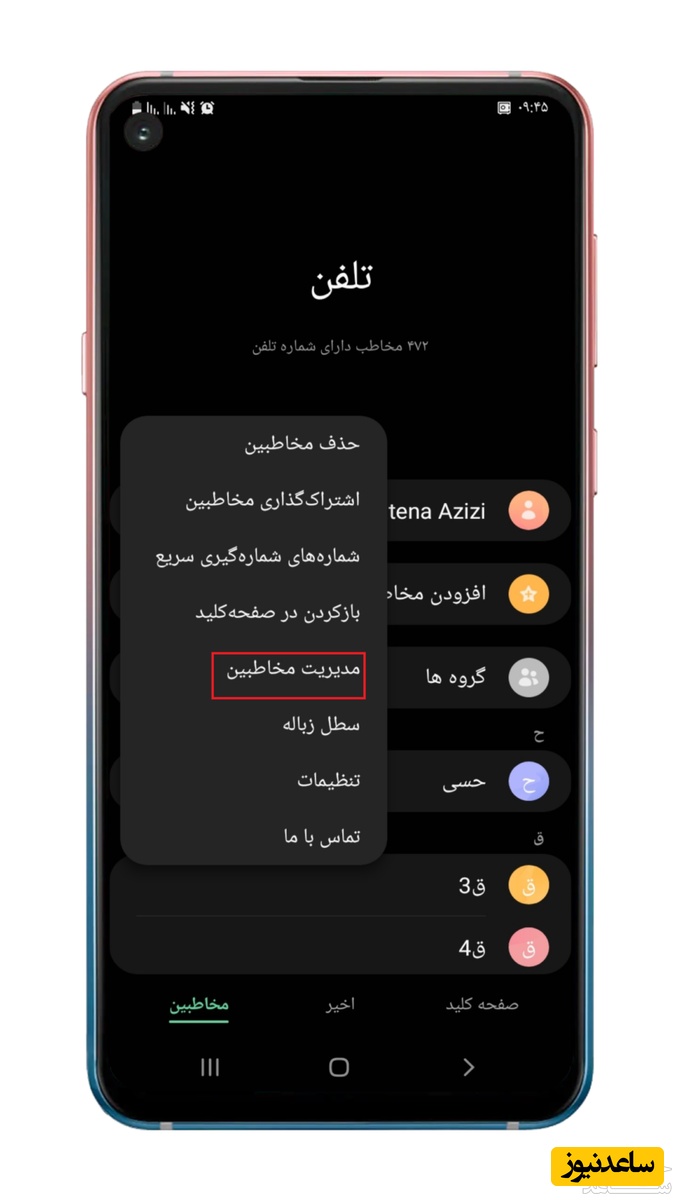 1. وارد قسمت مخاطبین یا contacts تلفن همراه خود شوید و بعد از انتخاب سه نقطه از منوی باز شده، گزینه مدیریت مخاطبین را انتخاب کنید.